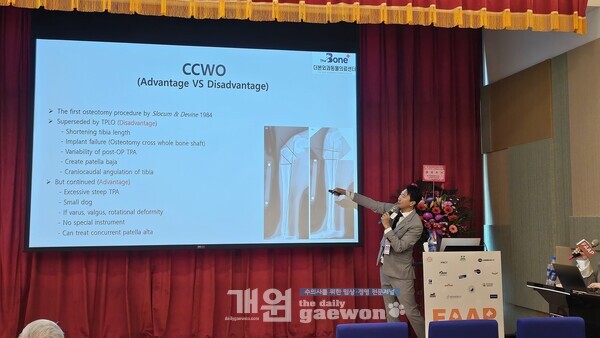 그는 “십자인대 파열 환자에서 알아야 될 수술법은 3가지가 있다. 바로 TPLO 수술, CCWO, 낭외고정술로 이 세 가지 수술만 알면 십자인대 환자는 다 해결할 수 있다”면서 “다만 이 세 가지 수술방법을 다 알아야만 어떤 환자 유형에도 적용할 수 있다. 따라서 오늘 강의는 참가자들의 이해도를 높이기 위해 기본적인 내용에 초점을 맞춰 동영상 자료들을 많이 활용했다”며 “그 중에서도 뼈를 절단해 수술할 수 있는 수술법에 대해 집중적으로 강의했다”고 설명했다.
