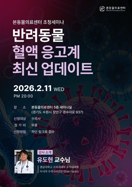 아시아 수의내과전문의(de Facto)인 유도현(경상대 수의내과학) 교수의 초청 세미나로 진행될 이날 세미나는 수의사 대상으로 무료로 진행된다.