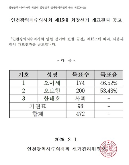 인천시수의사회 선거관리위원회는 2월 1일(일) 오전 9시부터 오후 5시까지 인터넷 투표를 실시, 개표 결과 오보현 후보가 총 유효투표수 472표 중 200표를 얻어 53.48%의 득표율로 당선을 확정지었다. 기권은 98표였다.