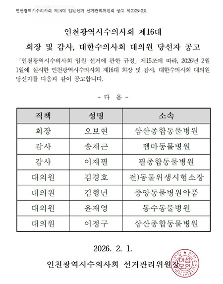 한편 이날 인천시수의사회는 제15조 임원 선거 규정에 따라 제16대 감사 및 대의원 선거도 실시, 당선인 명단은 다음과 같다.