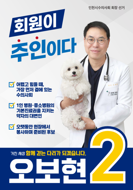 오보현 당선자는 “회원이 주인이다”를 캐치프레이즈로 △어렵고 힘들 때 가장 먼저 곁에 있는 수의사회 △1인 병원·중소병원의 기본 진료권을 지키는 약자의 대변인 △오랫동안 현장에서 봉사하며 준비된 후보를 내세우며 “거친 세상 함께 걷는 다리가 되겠다”는 공약을 제시한 바 있다.