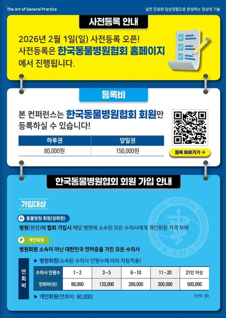 사전등록은 2월 1일(일)부터 한국동물병원협회 홈페이지(https://www.kaha.or.kr/)를 통해 진행되며, 카하 회원에 한해 등록 가능하다.