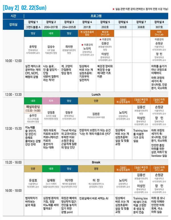 초음파 실습은 노다지(강원대) 교수가 맡아 양일간 진행한다. 첫째 날에는 오전 이론 강의로 ‘임상에서 바로 쓰는 고양이 심장초음파’를 다루고, 오후에는 실습을 통해 실제 영상 획득과 판독, 맞춤 교정을 진행한다. 둘째 날에는 ‘개 심장초음파’관련 이론강의와 실습을 동일하게 진행할 예정이다.