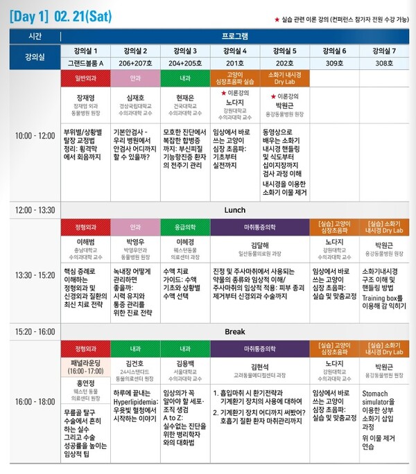 오후 4시부터는 홍연정(웨스턴동물의료센터) 원장이 ‘무릎골 탈구 수술에서 흔히 발생하는 실수와 수술 성공률을 높이는 임상적 팁’을, 김건호(24시스탠다드동물의료센터) 원장이 ‘하루에 끝내는 Hyperlipidemia: 우윳빛 혈청에서 시작하는 이야기’를 강의한다. 김용백(서울대) 교수는 ‘임상의가 꼭 알아야 할 세포·조직 생검 A to Z: 실수 없는 진단을 위한 병리학자와의 대화법’을, 김현석(고려동물메디컬센터) 과장은 ‘흡입마취 시 환기전략과 기계환기 장치’주제로 강의할 예정이다.
