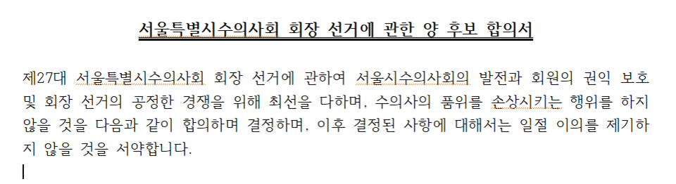 이에 따라 양 후보는 서수회장 선거와 관련해 이날 합의한 내용에 대한 합의서를 작성하고, 대수회 선거에 준하는 선거 방법을 진행하기로 했다. 대수회 또한 서수회장 선거에 적극 협조하기로 했다.