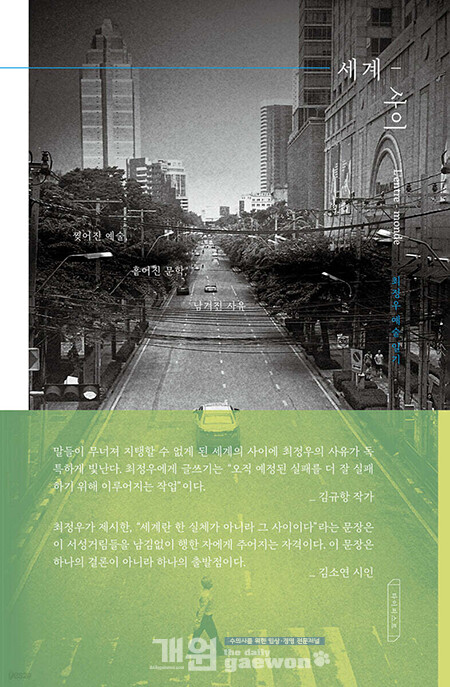 그가 재작년 하반기에 출간한 에세이 ‘세계-사이’는 다방면에서 인생의 이력을 보여주고 있는 선생의 예술혼을 조금이나마 이해할 수 있는 책이다. 부재가 ‘찢어진 예술, 흩어진 문학, 남겨진 사유’ 인데 그의 음악, 문학, 철학 및 미학에 대한 생각을 확인할 수 있다.
