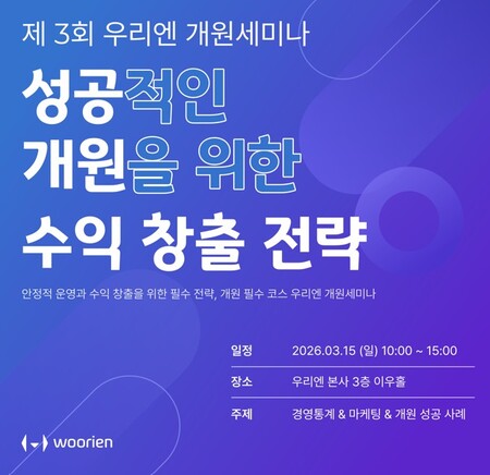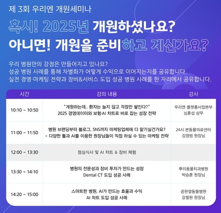 안정적 운영과 수익 창출을 위한 필수 전략으로 개원 필수 코스로 자리 잡은 ‘우리엔 개원 세미나’는 3월 15일 2026년을 여는 첫 개원세미나로 이전 세미나에서 높은 만족도를 기록한 프로그램을 바탕으로 콘텐츠 전반을 한층 강화하고, 개원을 준비 중인 예비 원장은 물론 개원 초기 운영에 대한 고민이 있는 원장까지 참여 대상을 확대, 성공한 병원들의 차별화 전략과 실제 운영 사례를 중심으로 병원만의 강점을 구축하는 데 필요한 실질적인 인사이트를 제공할 예정이다.