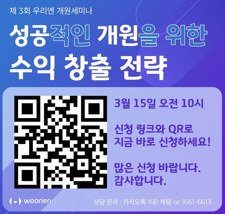‘제3회 우리엔 개원세미나’는 3월 12일(목)까지 우리엔 카카오톡 채널을 통해 자세한 내용을 확인할 수 있으며, QR코드 또는 링크를 통해 신청 가능하다.