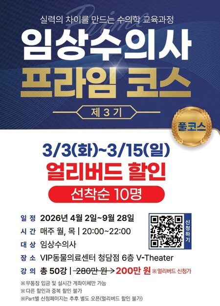 이번 제3기 프라임 코스는 △진료공통·임상병리(8강) △내과(11강) △외과(14강) △영상(7강) △내분비·종양·응급(10강) 등 총 5개 파트, 50강으로 구성됐다. 모든 수의사에게 꼭 필요한 기본 과정을 중심으로 기획됐으며, 필요한 강의만 선택해 수강할 수 있다. 파트별 신청 페이지는 추후 별도로 오픈될 예정이다.