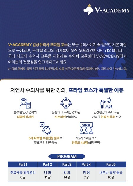 V-ACADEMY 운영을 맡은 김종인(VIP동물의료센터 청담점) 원장은 “모든 수의사에게 필요한 기본 과정을 체계적으로 정리한 프로그램”이라며 “제2기 프라임 코스가 만족도 4.8점(5점 만점)을 기록했을 정도로 호응이 높았던 만큼, 이번 3기 역시 실질적인 도움이 되는 교육이 될 수 있도록 준비했다”고 말했다.