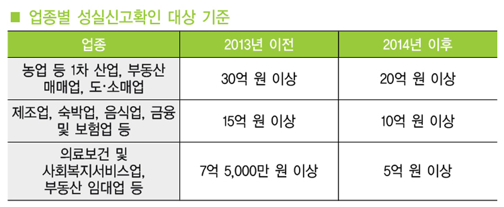 2014년부터 수입금액 기준이 낮아지면서 성실신고 확인대상이 증가하였다.