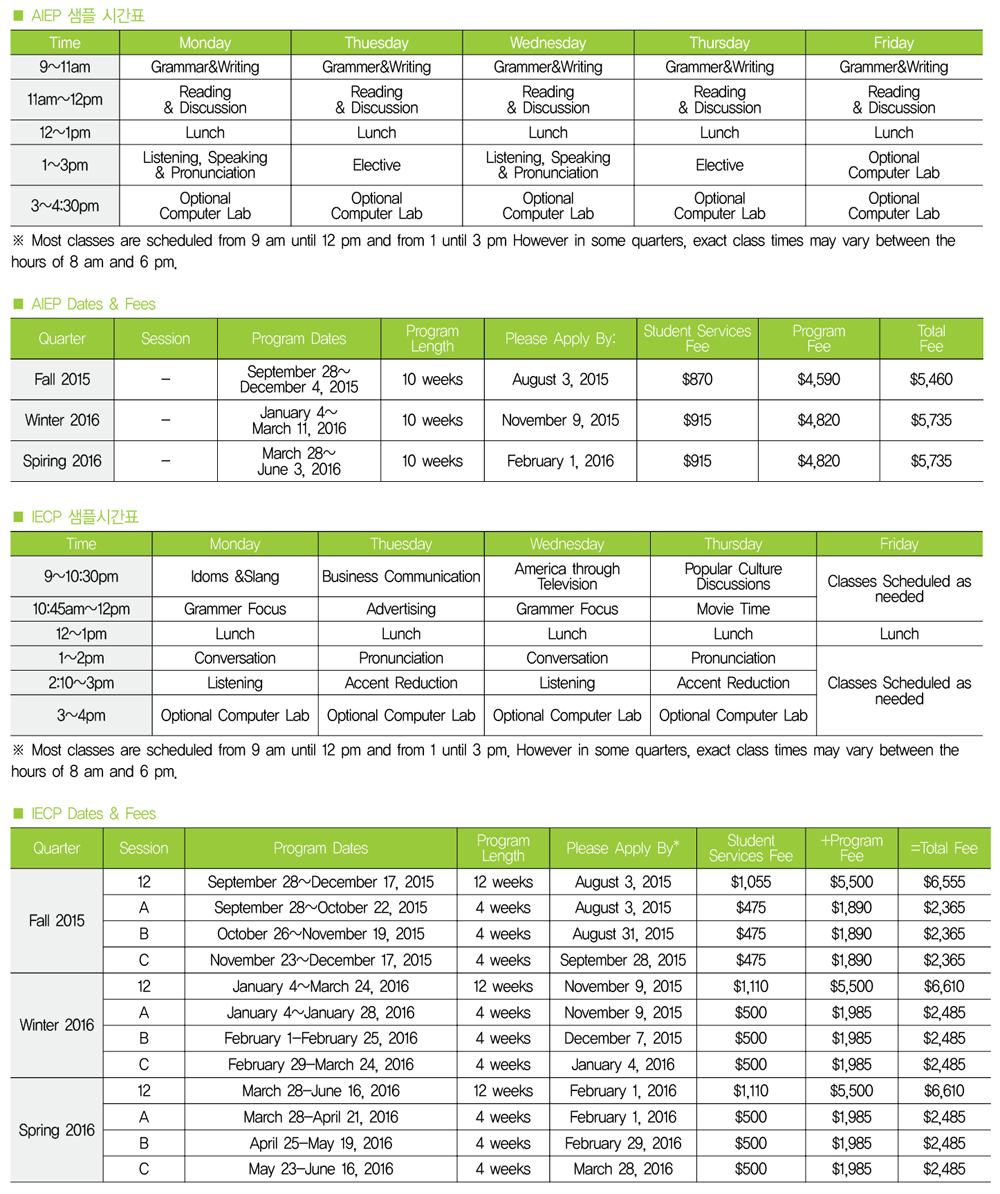 AIEP과정은 수업을 아카데믹한 부분을 많이 다루고 있어 미국의 대학에 입학과 편입을 목적으로 하는 학생들과, 개인적인, 전문적인 대화능력과 문서작성을 필요로 하는 학생들을 위해 만들어진 프로그램.