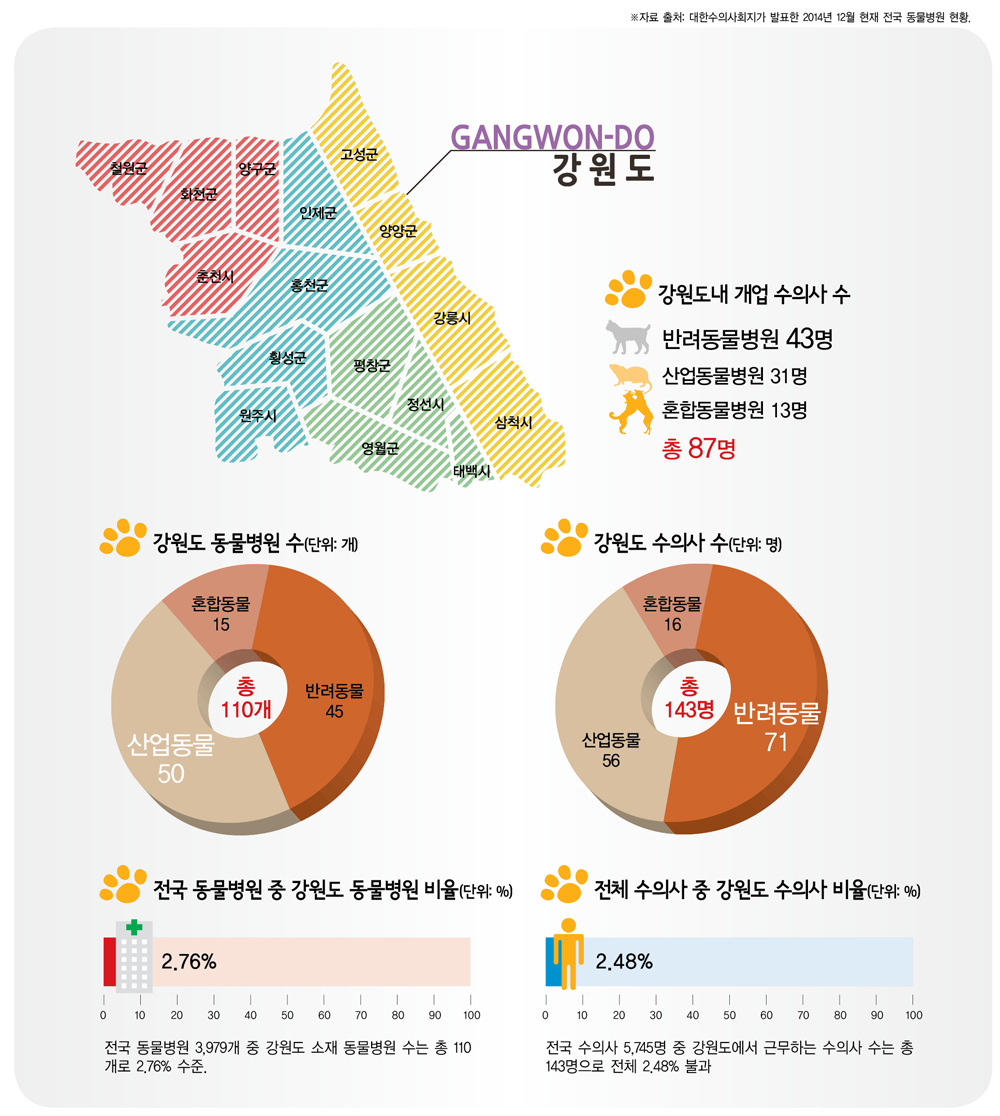 강원도 동물병원 110개·수의사 143명 전국 동물병원 중 2.8% … 전체 수의사 중 2.5% 수준 저작권자 © 데일리개원 무단전재 및 재배포 금지 개원 다른기사 보기 페이스북 트위터 URL복사 네이버라인 기사공유하기