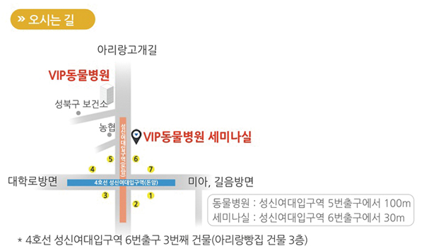 한편 이번 ‘안과학 세미나’는 4호선 성신여대입구역에 위치한 VIP동물병원 세미나룸에서 진행되며, 매회 오후 9시부터 11시까지 2시간 동안 진행된다.