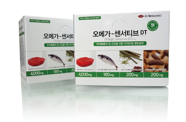 ‘오메가-센서티브 DT’는 소시지 타입의 영양제로 케어사이드의 히트 상품인 ‘오메가-덤’의 기술력과 생산시설을 기반으로 민감한 장으로 인해 변비와 설사에 시달리거나 소화를 잘 시키지 못하는 반려동물의 장 건강에 탁월한 효과가 있는 것으로 알려지고 있다.