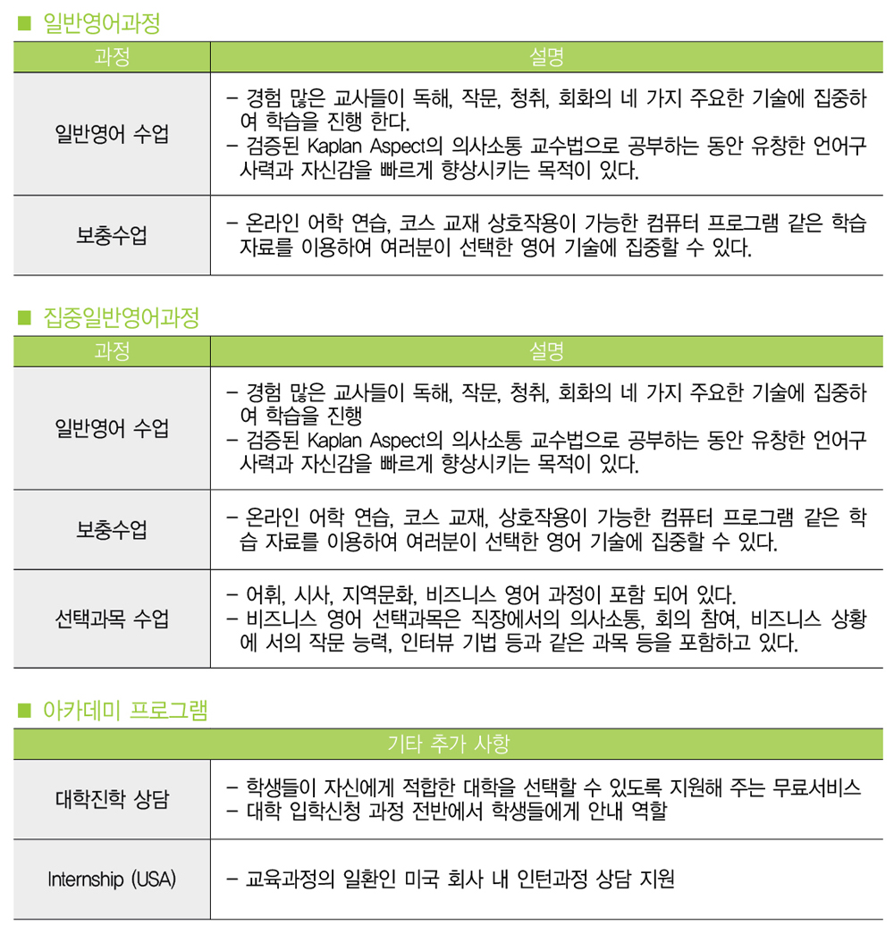 - 집중과정: 주당 추가선택 과정으로 8레슨 포함