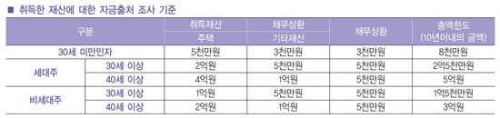 결론은 아니다. 표1과 같이 취득한 재산과 해당재산 취득일로부터 소급하여 10년 이내 취득한 재산의 합계액 또는 채무상환액이 기준금액 이하라면 자금출처조사를 배제하여 준다.