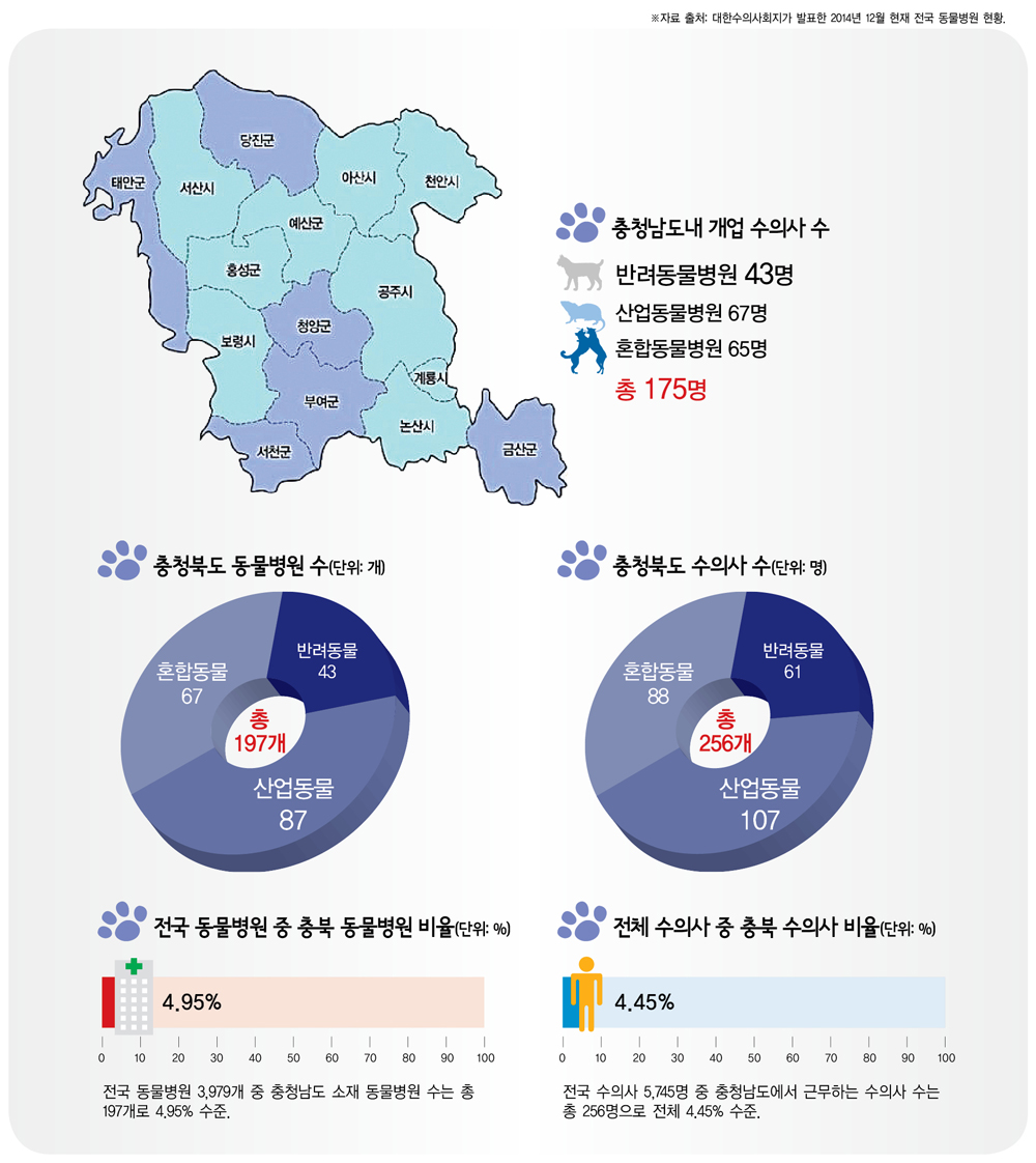 충남 동물병원 197개·수의사 256명 전국 동물병원 중 5% 분포 … 전체 수의사 중 4.5% 수준 저작권자 © 데일리개원 무단전재 및 재배포 금지 개원 다른기사 보기 페이스북 트위터 URL복사 네이버라인 기사공유하기