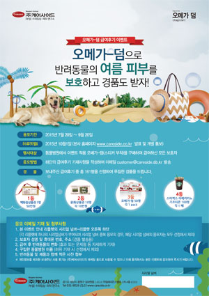동물병원에서 이벤트 적용 스티커가 부착된 ‘오메가-덤’을 구매해 급여한 모든 보호자를 대상으로 하는 이번 이벤트는 급여후기와 기재사항을 작성해 이메일(customer@careside.co.kr)로 발송한 사람 중 161명을 선정해 푸짐한 경품을 제공한다.