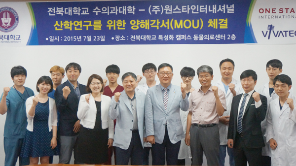 전북대학교 수의과대학(학장 김남수)과 (주)원스타인터내셔널(대표이사 손재훈)이 지난 7월 23일(목) 전북대학교 특성화 캠퍼스 동물의료센터 2층에서 ‘산학연구를 위한 양해각서(MOU) 체결식’을 갖고, 양 기관 간 기술개발 및 지원, 정보교환, 자문요청, 기타 제반 업무의 상호 긴밀한 협력을 위한 산학협약을 체결했다.