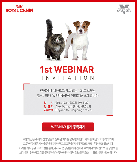 로얄캐닌이 오는 6월 17일(화) 저녁 8시 30분부터 ‘제1회 로얄캐닌 웹-세미나, WEBINAR’를 한국에서 처음으로 개최한다.
