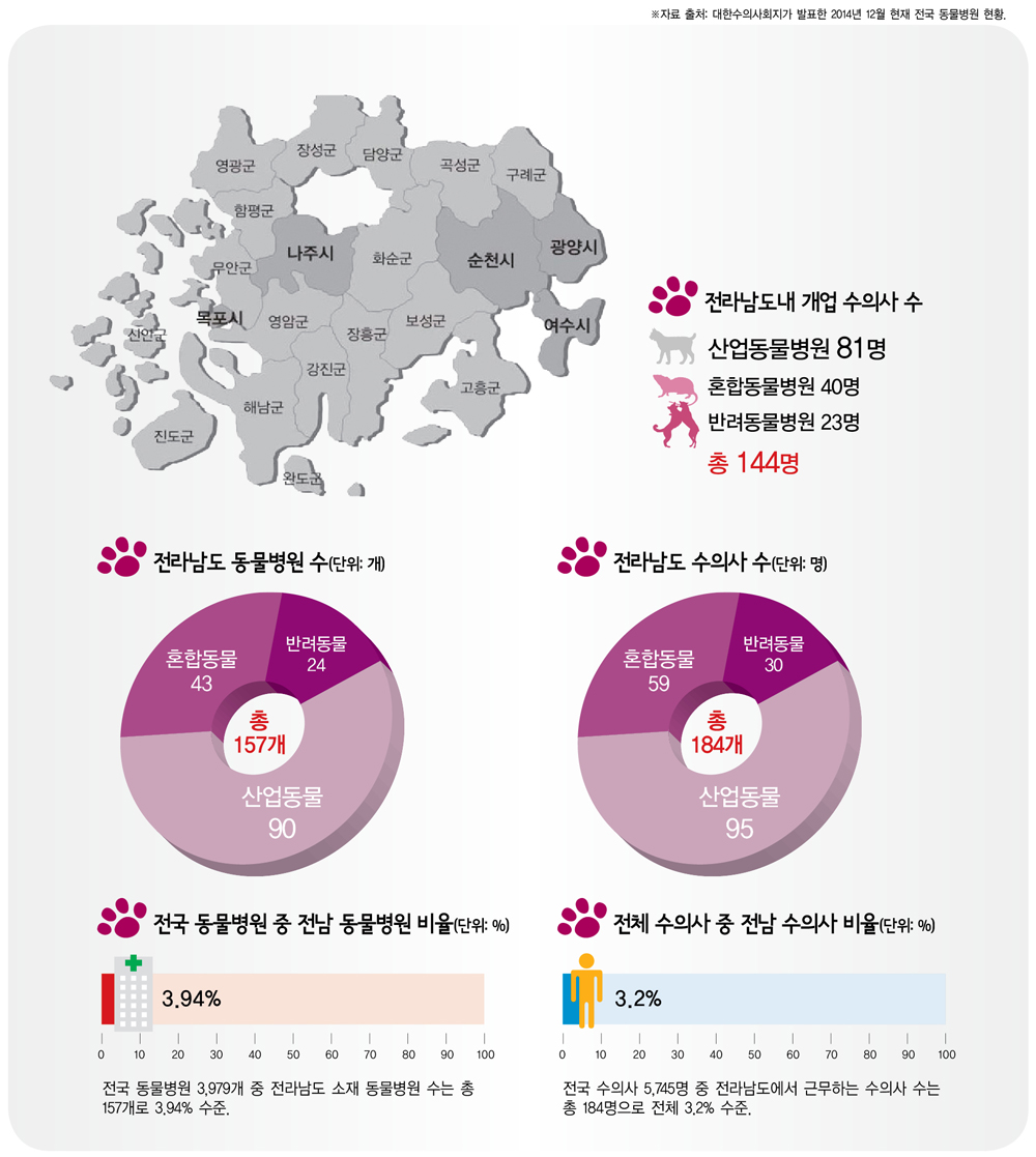 전남 동물병원 157개?수의사 184명 전국 동물병원 중 3.9% 분포 … 전체 수의사 중 3.2% 수준 저작권자 © 데일리개원 무단전재 및 재배포 금지 개원 다른기사 보기 페이스북 트위터 URL복사 네이버라인 기사공유하기