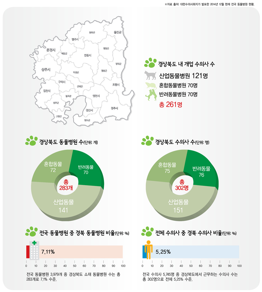 경북 동물병원 283개·수의사 302명 전국 동물병원 중 7.1% 분포 … 전체 수의사 중 5.3% 수준 저작권자 © 데일리개원 무단전재 및 재배포 금지 개원 다른기사 보기 페이스북 트위터 URL복사 네이버라인 기사공유하기