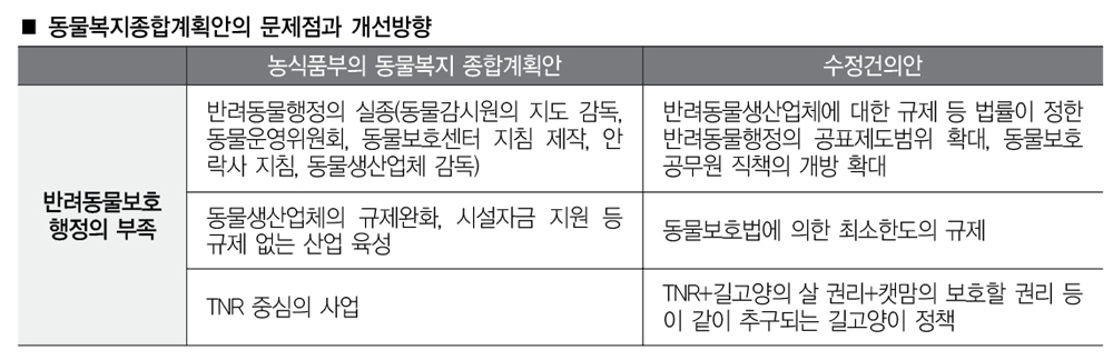 정부가 종합계획에서 밝힌 것처럼 기존의 동물보호정책 전반에 대한 문제점이 인력부족과 현황 파악 및 정책 수립과 효과 분석이 어렵다는 외부적 요인 탓으로만 돌리기엔 행정상의 문제가 더 크다고 꼬집었다.