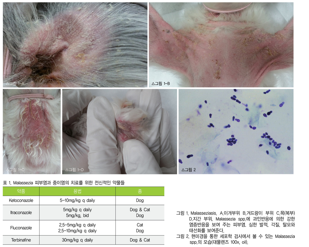 Malasseziapachydermatis는 정상적인 개와 고양이에서 외이도, 구강 주변, 항문주위와 습성피부 주름 사이에 소량이 존재한 기회감염병원체이다.