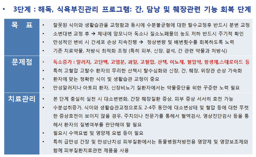 C. 3단계-해독, 식욕부진관리 프로그램: 간, 담낭 및 췌장관련 기능 회복 단계: 잘못된 식이와 생활습관을 교정함과 동시에 수분불균형에 대한 탈수교정이 진행되면서 반드시 분변의 교정도 매우 중요합니다.