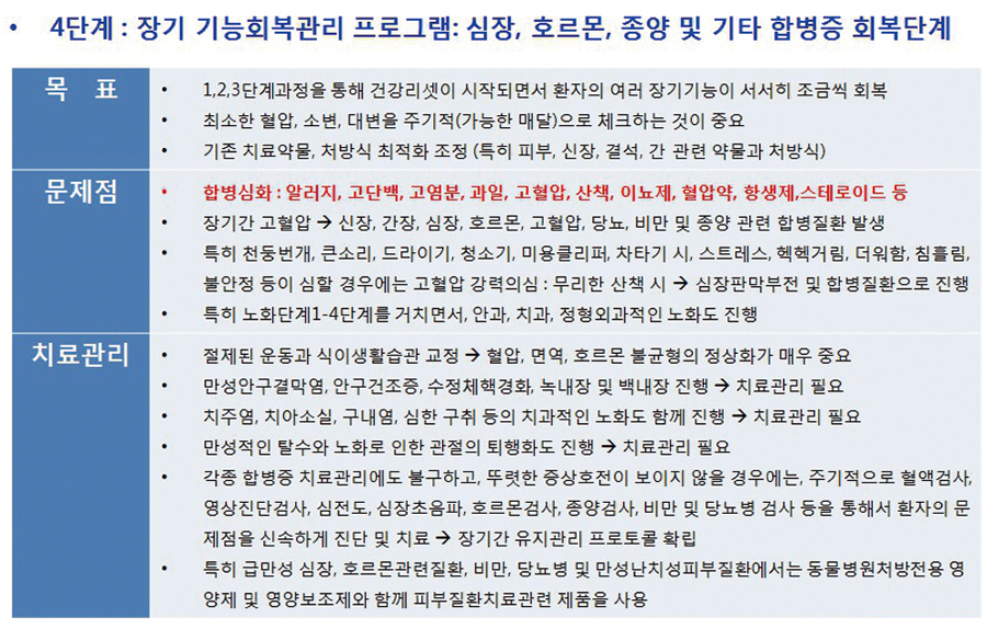 D. 4단계-장기 기능회복관리 프로그램: 심장, 호르몬, 종양 및 기타 합병증 회복단계: 잘못된 식이와 생활습관을 교정함과 동시에 수분불균형에 대한 탈수교정이 진행되면 반드시 분변의 정상화가 시작되면 환자의 신장과 간장의 기능이 서서히 조금씩 회복되게 됩니다.