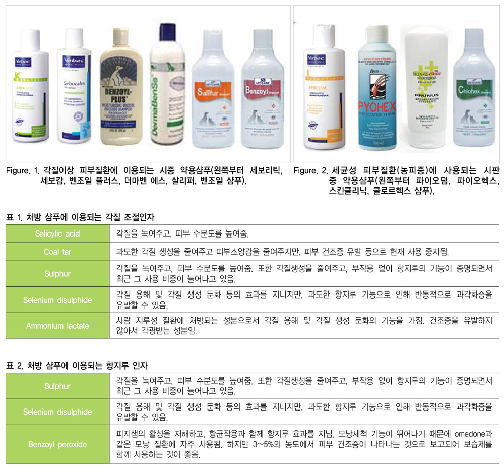 피부의 상태에 따른 적절한 성분의 샴푸를 선택하고, 또 적절한 용법을 통한 적용의 기술은 수의 피부임상에 있어 매우 중요한 부분이 되고 있다.
