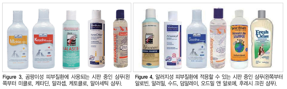 2) 말라세지아 피부염(Malassezia dermatitis): 말라세지아에 의한 피부감염증은 각질이상 피부질환이나 지루성피부염을 자주 일으키는 원인이 되므로 앞서 설명한 그에 관련된 샴푸를 일차적으로 사용하면 항진균 치료가 더 용이해진다.
