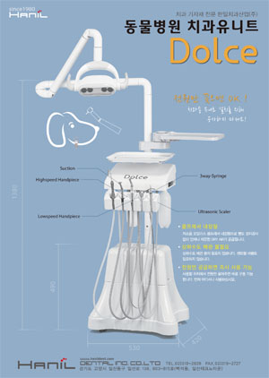 한일치과산업 측은 “별도의 설치 없이 ‘돌체’는 바로 전원만 꽂아 사용할 수 있는 매우 효율적인 수의치과 장비”라며 “상하수도 배관이나 센트럴 바큠도 필요하지 않으며, 특히 저소음 오일리스 콤프레셔가 내장돼 있어 항상 깨끗한 Dry Air를 공급한다”고 말했다.