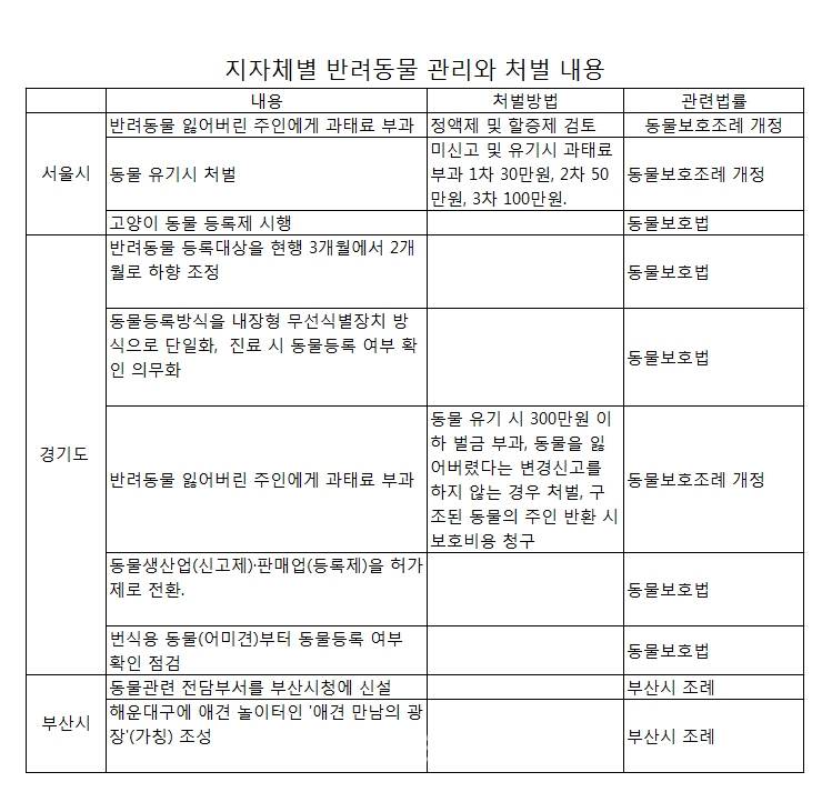 서울시뿐만 아니라 경기도와 대구, 제주도 등 대부분의 자치단체에서 유기동물에 대한 처벌을 강화하는 법률안을 개정하고 있을 정도로 반려동물 학대에 대한 처벌은 갈수록 강화되고 있는 상황이다.
