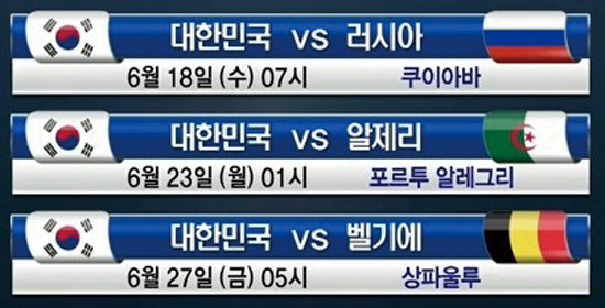 우리나라 축구 대표팀은 러시아, 알제리, 벨기에와 함께 H조에 속해 있다. 첫 경기는 오는 6월 18일(수) 오전 7시 러시아와 맞대결. 이후 두 번째 경기는 알제리를 상대로 23일(월) 새벽 4시에 대결을 벌인다. 브라질 월드컵 16강을 결정짓는 마지막 3차전은 벨기에와 27일(금) 새벽 5시에 진행된다.