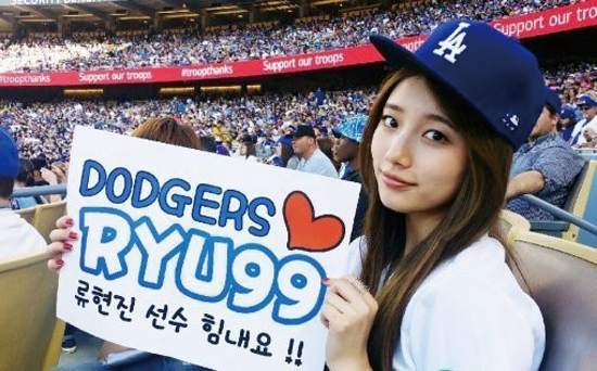 ‘국민 첫사랑’ 수지가 LA에서 류현진의 경기를 관람하는 모습이 포착됐다. 수지는 지난 5월 27일 류현진이 선발투수로 나선 경기장을 찾아 응원했다.