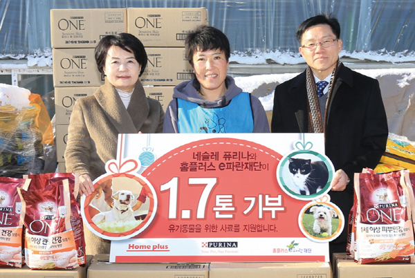네슬레퓨리나가 지난 1월 14일 ‘제4회 유기반려동물을 위한 100g 사랑’ 캠페인을 시행하고, 홈플러스 e파란재단을 통해 안성시에 있는 ‘400마리 강아지의 행복한 보금자리’에 사료 1.7톤을 전달했다.