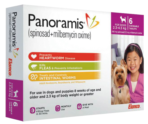 ‘파노라미스’는 밀베마이신 옥심과 스피노새드(spinosad)의 조합으로 이루어진 심장사상충, 내부기생충(회충, 십이지장충, 편충), 외부기생충(벼룩) 예방약이다.