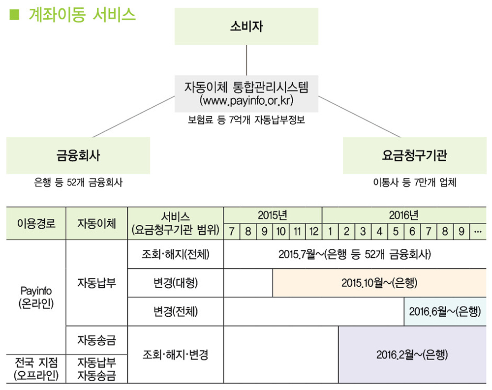 2015년 7월 Payinfo 홈페이지 오픈 및 ‘자동납부 조회?해지’ 서비스를 시작으로 단계적으로 시스템을 구축하여 올해 2월부터는 페이인포(www.payinfo.or.kr) 및 전국 은행지점 어디서나 자동납부?송금에 대한 조회?해지?변경서비스를 이용할 수 있게 되었다.