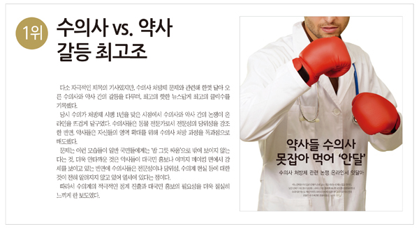 임상수의사들이 가장 관심 있는 이슈는 무엇일까. 본지 개원이 창간 2주년을 맞아 지난 2년간 보도된 개원가 기획기사 중 온라인 클릭수를 통해 임상수의사들의 주요 관심사와 트렌드를 알아봤다. 가장 많은 클릭을 받은 기사는 수의사와 약사 간의 갈등 문제로 그 뒤를 애견보험시장, 3D 프린터, 원격진료, 노령동물이 잇고 있어 개원가의 관심 키워드로 ‘경쟁과 비전’을 꼽았다. <편집자주>