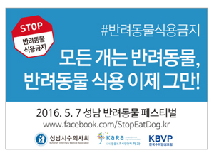 성남시수의사회와 동물보호시민단체 카라 및 KBVP가 공동으로 주최하는 ‘2016 성남 반려동물 페스티벌’에서 반려동물 식용금지를 위한 캠페인을 벌이고 있다.