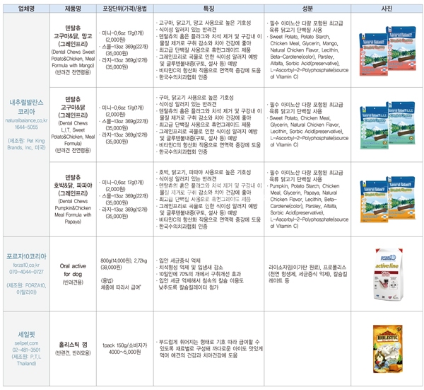 다음에 소개하는 구강보조제품들은 기본적으로 치석과 치태, 플라그 및 입냄새 감소 효과를 보이고 있고, 기호성과 소화흡수율에 영양학적인 측면까지 고려한 제품들이다.