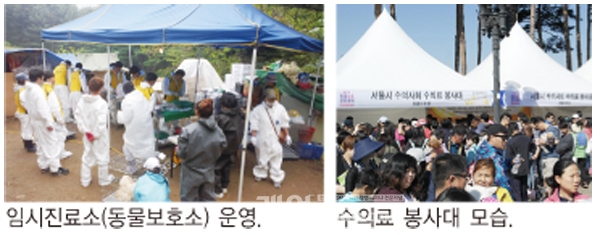 이번 봉사활동에는 수의료봉사대장 이인영 의원을 비롯해 서수회 손은필 회장과 대한수의사회 김옥경 회장 등 봉사대원 30여명과 KBS 개그맨 동물보호봉사단 ‘허그’(HUG 단장 양선일)가 함께 참여해 예방접종 250두와 피부질환과 이비인후과, 안과진료 등 40~50두를 진행하고, 내외부기생충 예방과 보호 동물의 진찰 및 치료, 질환별 사양관리 상담과 사료지원 등을 진행했다.