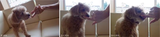 위 3주간의 연습이 진행되는 동안 별도로 평소 반려동물을 쓰다듬으며 입 주변을 만지고 입술을 들었다 놓는 연습을 반복함으로써 반려동물이 입주변의 터치에 둔감하게 되도록 만들어 줍니다.