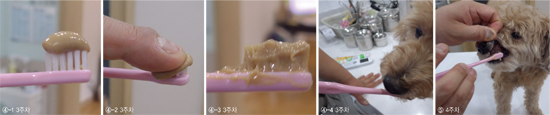 셋째주: 칫솔에 치약을 놓고 손가락으로 치약을 칫솔모 속으로 모두 들어갈 수 있도록 눌러 준비합니다. 이 준비된 칫솔의 치약을 반려동물이 핥아 먹을 수 있도록 합니다.