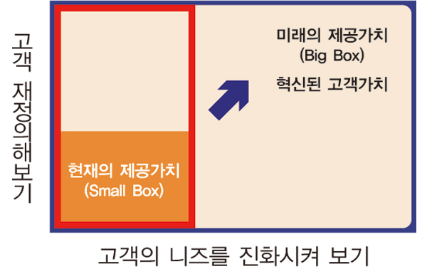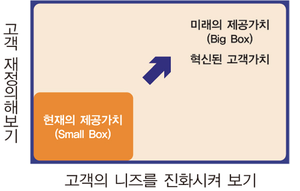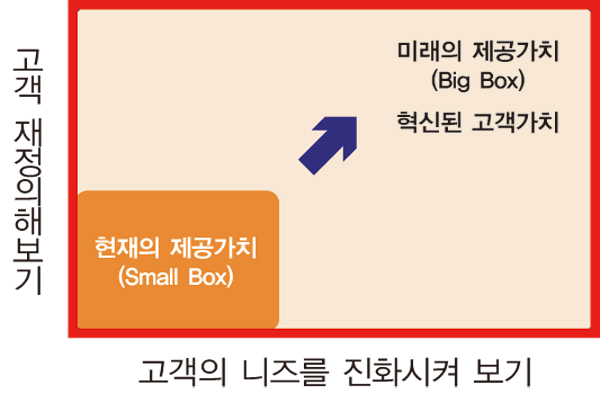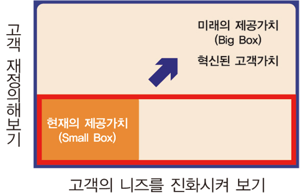 Box의 가로축은 ‘고객의 욕구는 끊임없이 진화한다’는 사고를 항상 가지는 일이고, 세로축은 ‘우리의 고객을 늘 재정의 해보는 것’입니다(그림 1 참조).