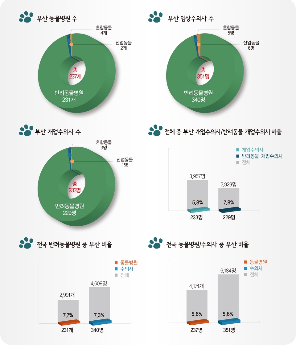 부산광역시 부산 동물병원 237개‧수의사 351명 전국 병원 중 부산에 5.6% … 전체 수의사 중 5.6% 분포 ※자료출처: 대한수의사회지(2016년 6월 현황) 저작권자 © 데일리개원 무단전재 및 재배포 금지 개원 다른기사 보기 페이스북 트위터 URL복사 네이버라인 기사공유하기