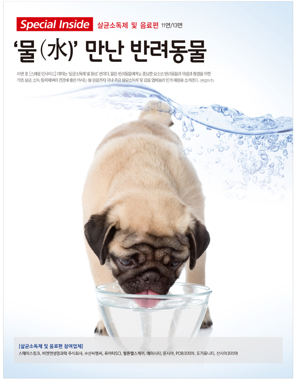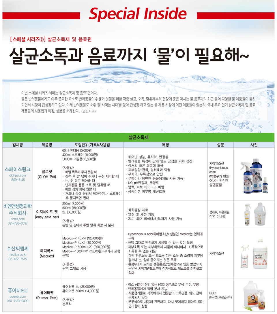 물은 반려동물에게도 아주 중요한 요소로 반려동물의 위생과 청결을 위한 각종 살균, 소독, 탈취제부터 건강에 좋은 마시는 물 음료까지 최근 들어 다양한 물 제품들이 출시되면서 시장이 급성장하고 있다. 이제 반려동물도 소위 ‘물 사먹는 시대’를 맞아 급성장 하고 있는 물 제품 시장에 어떤 제품들이 있는지, 국내 주요 인기 살균소독제 및 음료 제품들의 사용법과 특징, 성분을 소개한다. <편집자주>