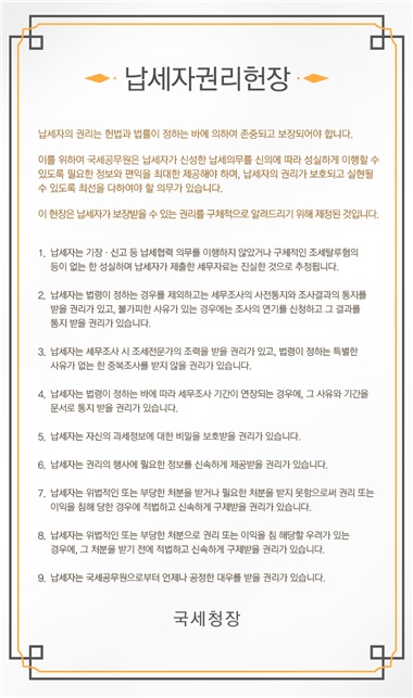 이에 따라 만들어진 것이 바로 ‘납세자권리헌장’이다. 이 헌장은 납세자가 보장받을 수 있는 권리를 구체적으로 알리기 위해 제정되었다.
